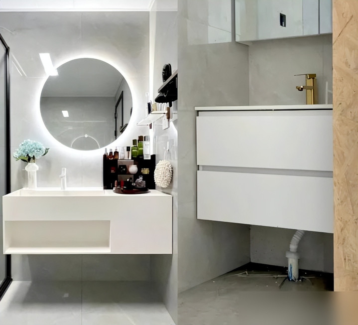 浴室装墙排洗手盆更是明智之选,少了那截丑丑的排水管,浴室柜底下清爽好打扫,拖把一推就干净。